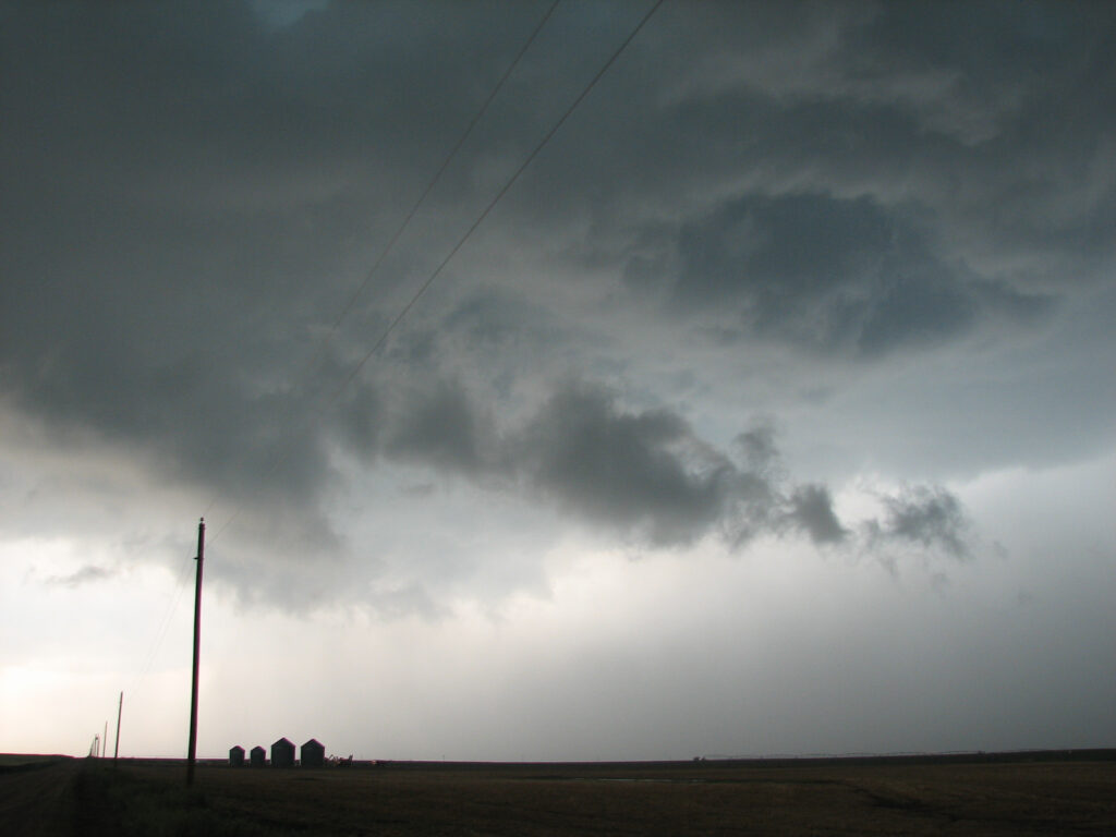 Eventually a cell started firing near Protection, KS and we headed back southwest towards that cell. We were right under the cell when a tornado warning was issued for it. It dropped some very low clouds around us, and a funnel hung from the storm into the field right next to us. Lightning struck the phone pole right by us and scared us all half to death. We decided to move then and headed towards Greensburg in order to not get cored by hail.