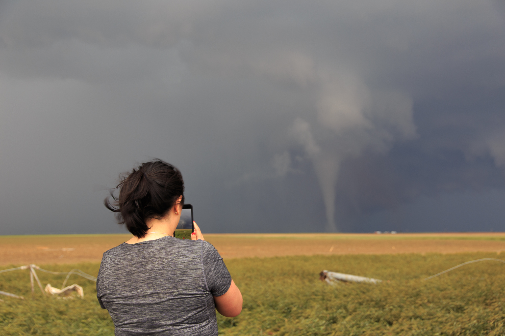 We helped her and her husband out of their shelter with their dogs and got her to sit in Stephens’ vehicle. I also had to deal with a flat tire and an ongoing tornado to our east. I setup a tripod and Jari and I worked together to change the tire.