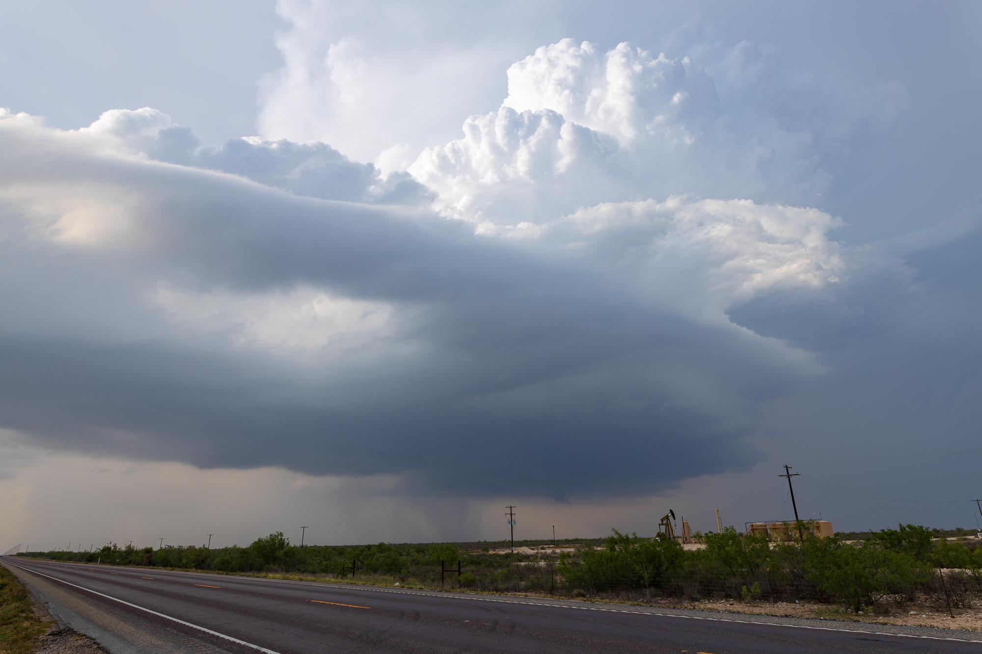 I sat along the boundary. It continued to push south and west. The “wedge” area to the west of Brownfield had the most agitated cu. The wedge referring to the area between the OFB and Dryline of warm/moist air. I sat on back roads between Brownfield and Plains for awhile watching attempts go up and fail. I’d eventually head to Plains and gas up at Allsups.